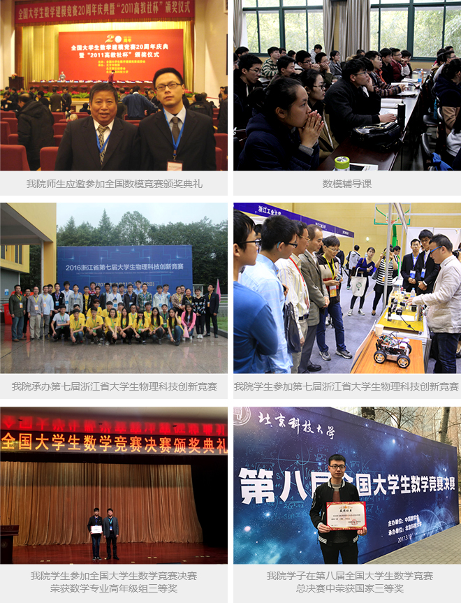 负责指导的我校国际大学生数学建模竞赛、全国大学生数学建模竞赛、全国大学生数学竞赛、浙江省大学生高等数学竞赛、浙江省大学生物理创新(科技)竞赛、浙江省大学生物理创新(理论)竞赛和“泰迪杯”数据挖掘挑战赛,共取得国际一等奖2项、二等奖7项、三等奖5项,全国一等奖80项、二等奖122项、三等奖186项、优胜奖110项,浙江省一等奖255项、二等奖591项、三等奖1166项。