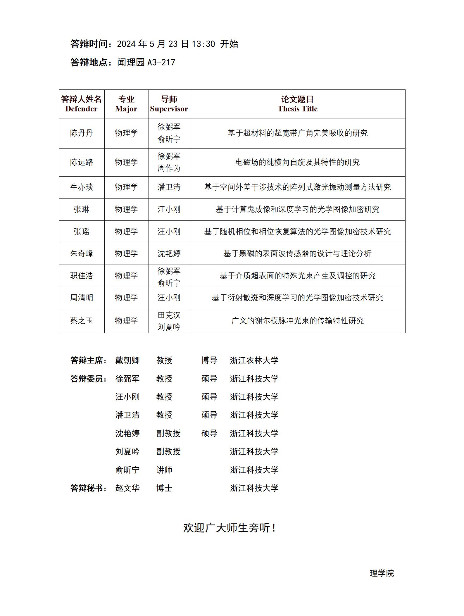 2024年91HUB 硕士研究生学位论文答辩公告(物理学1组)
