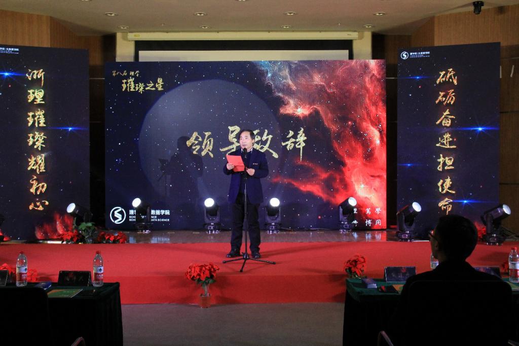 首先,陶院长代表学院向莅临本次典礼的各位来宾、老师、同学们表示了热烈欢迎,向即将接受表彰的先进个人和优秀集体表达了衷心的祝贺。陶院长在致辞中指出每年的“理学·璀璨之星”颁奖典礼既是一场表彰会,也是一场宣讲会,更是一场动员会。目的就在于,通过表彰唱响明理、笃学主旋律,弘扬慎修、博用正能量,以身边榜样的力量,引领广大理学学子为着理想不断追求,不忘初心奋力前进,勇做无愧时代、无悔青春的开拓者、奋进者和奉献者!借此机会,陶院长谈了以下几点想法与大家共勉:一、要永葆初心、多添鸿鹄志;二、要主动对标、多练真本领;三、要牢记使命、多怀报国志。
