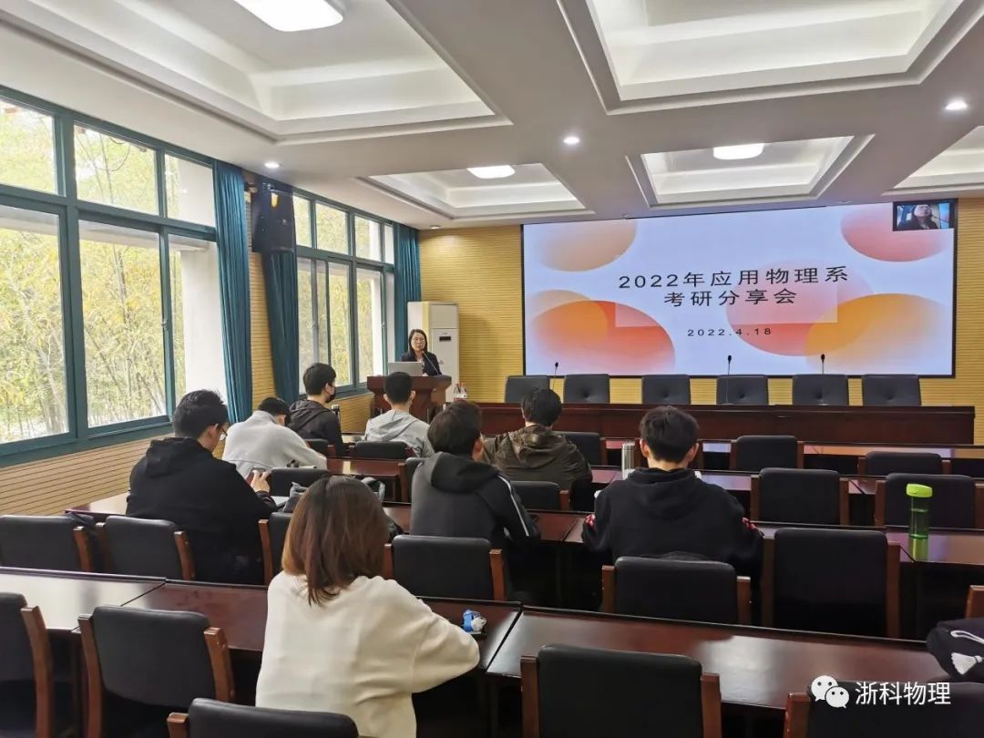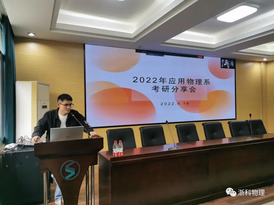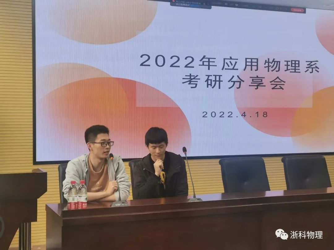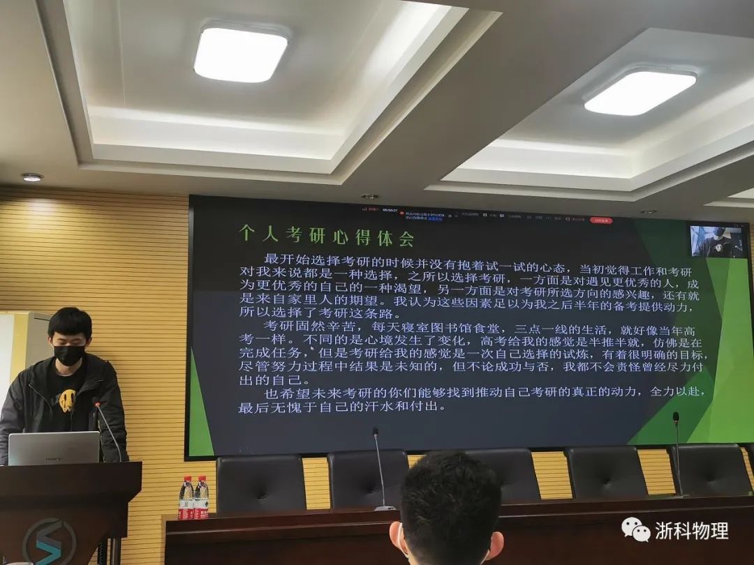 本次活动邀请了18级上岸华科物理系的黄勇涵、上岸华科光学工程蒋立治、上岸宁波大学物理系杨永磊、上岸南京邮电大学物理系的韩俊辉来做了考研经验分享。本次活动采取了线下线上相结合的方式,在“浙科物理”钉钉群中进行了同步直播。孙婷婷老师、黄喆老师和19级、20级的部分同学一起参与了线下交流。