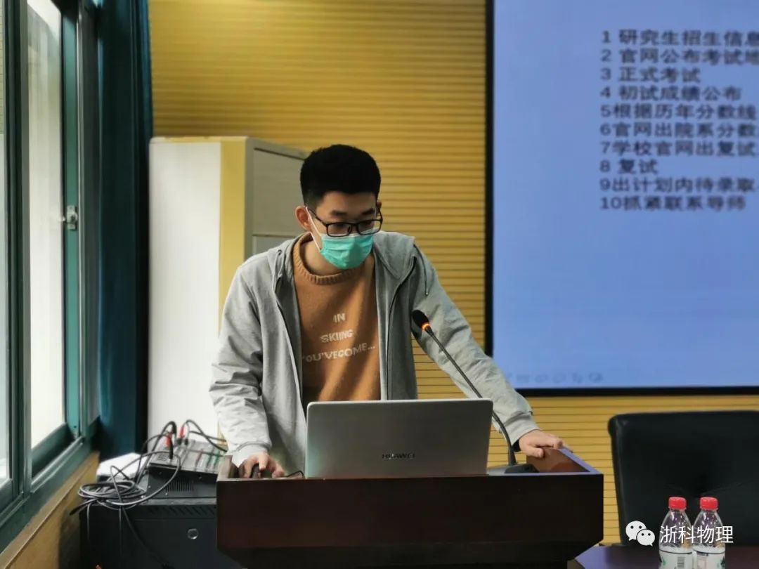 孙婷婷老师为本次交流会做了开场白。孙老师首先强调了考研的重要性和必要性,鼓励了同学们通过考研走向更大更强的平台,从而开阔自己的眼界,提升竞争力。然后,孙老师对取得优异考研成绩的18级同学表示了热烈的祝贺,并预祝他们在新的平台给母校增光添彩。接着,孙老师建议学弟学妹们认真聆听和学习学长们的考研经验汇报,借鉴学习方法,吸取经验教训,做出最适合自己的选择,坚定自信地走上考研这条路。最后,孙老师表达了对19级、20级同学们的期待和祝福,愿浙科物理的学子都能有美好的前途。