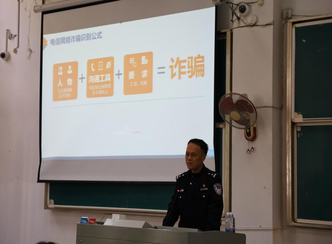 讲座上,马警官对电信网络诈骗的形势进行了深入分析,通过通俗易懂的话语告诉大家什么是电信网络诈骗以及电信网络诈骗的常见形式。马警官用深入浅出的语言、生动具体的案例、具有教育意义的宣传视频,呼吁同学们要做好电信网络诈骗的识别防范,提高对电信诈骗的警惕性。