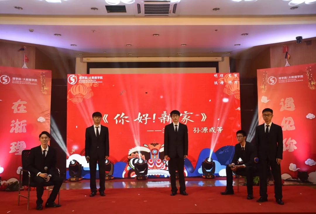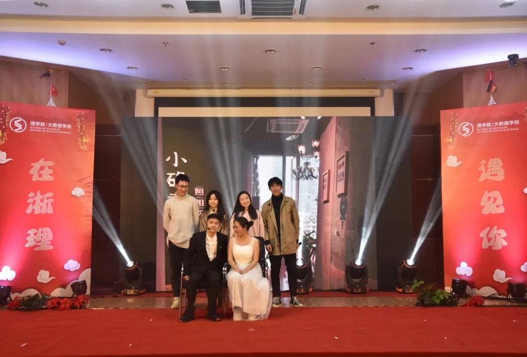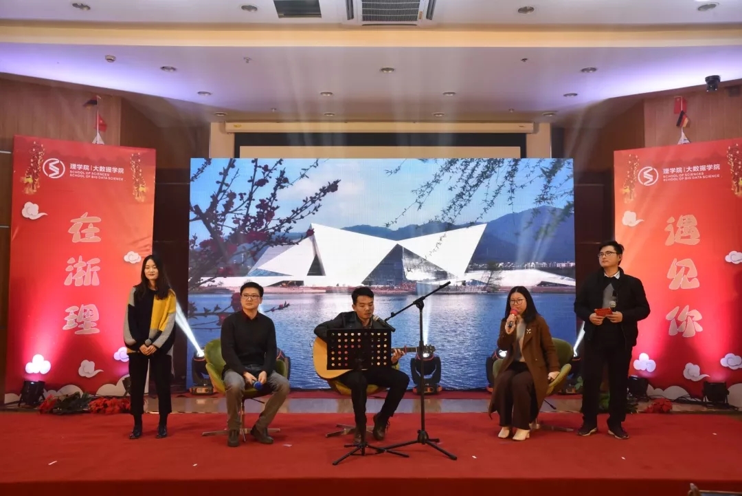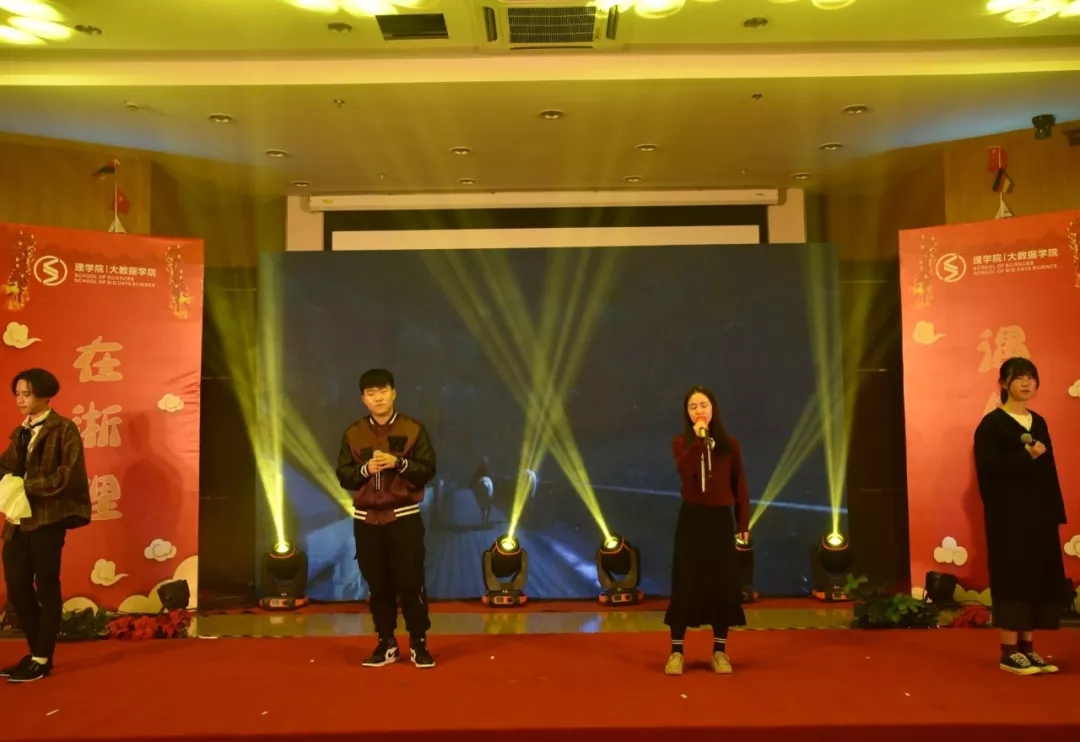 老师项楠、王宝明、吴鹤群、杨娇、石大力(从左往右)组成的“理学天团“凭一曲《知足》首次亮相,带动了台下同学齐唱,将晚会气氛推向了高潮。