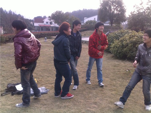 本次班会开始时,同学们自由分成了四个小组。由孙盼和邵云龙共同组织。第一轮将准备好的成语给组员,通过接龙之后,将之放到特定的情境中,具有很强的幽默效果。第二轮是数字循环,在其他同学的欢呼声中,参加的同学紧张的进行着比赛,一个一个淘汰,最终的获胜队得到加分。接下来的是萝卜蹲,其中三个小组不由自主的“针对”其中一个全部是男生的小组,以及接下来的歌曲接龙,笑声不断。最后的获胜队队员被男生高高的抛到了天上。