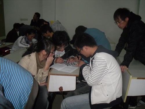 第二轮填空题,给大家留下思考空间。经过四组这一轮的表现,我们发现林潜同学的知识真是丰富啊,让我们大家的注意力都转向他。他知道“珊瑚婚是指结婚35周年 ”、“ 世界上现存最大的佛教艺术宝库是敦煌石窟 ”、“ 我国唯一的两个皇帝合葬在一起的是唐高宗跟武则天”等等。虽然下面两个问题对于我们很熟悉,可是要一时想起还是有点困难的,这也说明我们缺乏的知识多了吧,也可说明我们搞此活动是有意义的。这一轮是以王淑羽、毛竞玲、吴晶为代表的组要接受惩罚,惩罚项目也与上一轮不同,在这一轮,我们有幸见识到王小龙同学背着黄晓明绕教室一圈、毛竞玲组全体罚体力----蹲站30下和吴晶组全体跳兔子舞绕教室两圈。此时全场笑爆,热闹非凡。