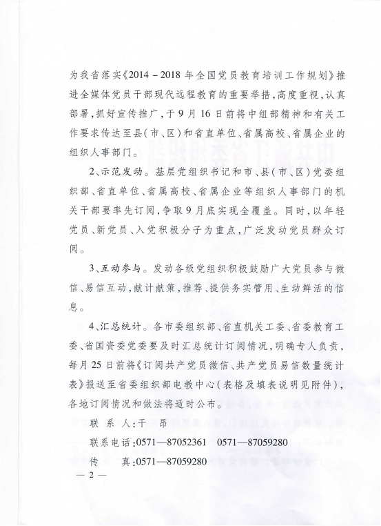 现将省委组织部《关于做好共产党员微信、易信订阅工作的通知》(浙组办﹝2014﹞5号)转发给你们,请按通知要求,发动广大师生党员根据使用习惯订阅共产党员微信或易信,并于每月23日前,将《订阅共产党员微信、共产党员易信数量统计表》报组织部(2014年10月份开始,只需报送每月新增党员订阅情况统计)。Email:[email protected]。联系电话:85070107。