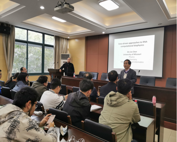 做了题为“Data-driven methods for RNA computational biology”的精彩学术报告。陈世杰教授2012年当选为美国物理学会(APS)Fellow,是密苏里大学董事会冠名杰出教授,任职于密苏里大学物理与天文系、生物化学系、数据科学与信息学研究院,一直从事RNA的多领域交叉科学研究。报告由浙江科技学院党委委员、91HUB
