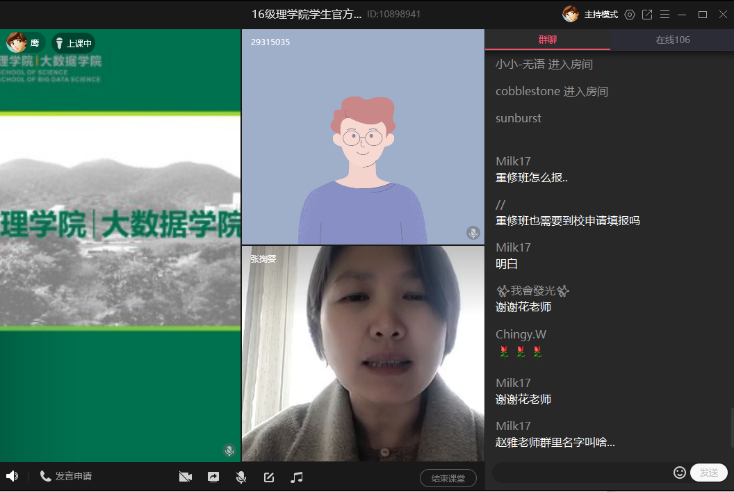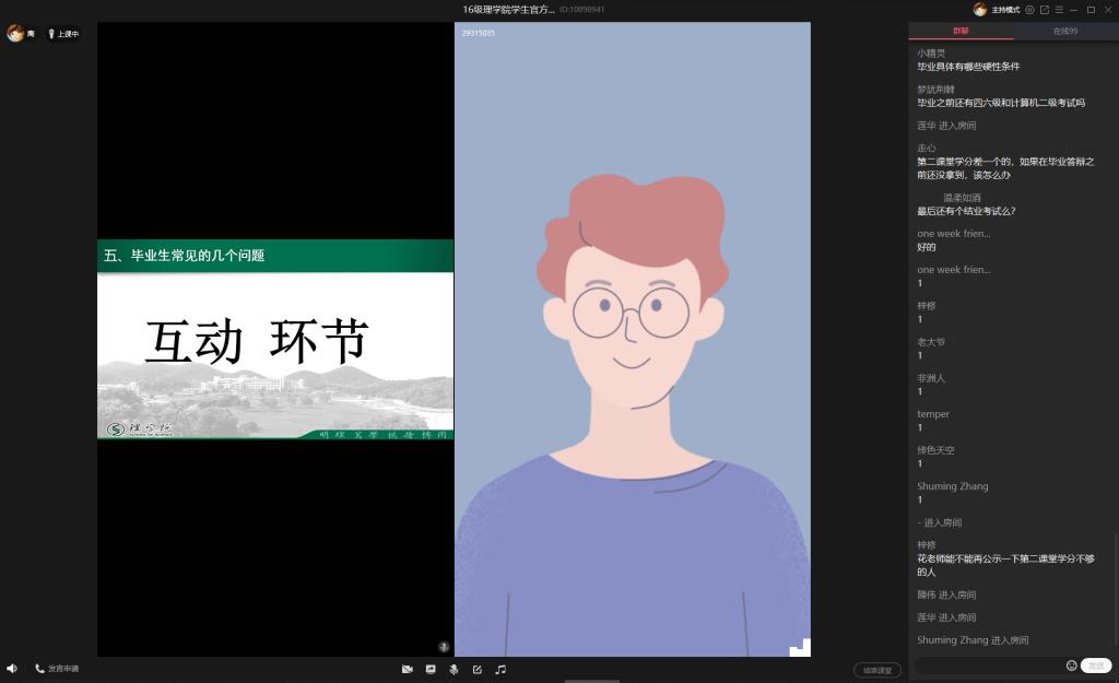教务员花彩霞老师就毕业论文答辩、课程加修重修、补考等具体问题工作做了详细的布置,在互动环节就毕业生提出的疑问一一耐心回答。