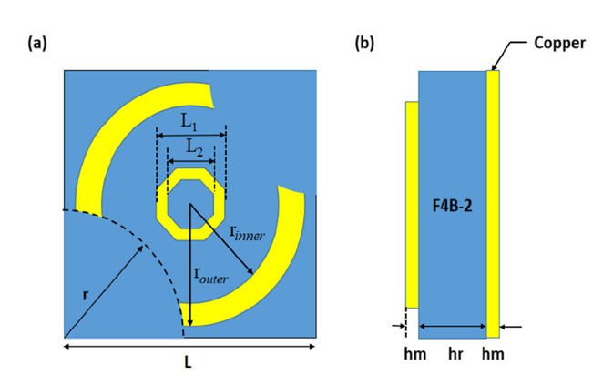 该论文的题目为”Broadband microwave absorber with a double split-ring structure”,研究了一种新型的超材料的微波吸收器,并在一定的带宽范围内实现了完美吸收,并用电磁波的理论对微波的吸收进行了解释,该研究对后续的超材料的研究发展提供了一个新的思路。对于电磁吸波器而言,超材料的吸收损耗特性正好变成了优点。在论文中,我们设计了一种由金属表面和连续金属层组成的非对称结构与圆双分裂环吸收器。这种双裂环式的吸收器由介电材料层和两层金属组成,其中顶层金属由双裂环谐振器(DSRR)和中心图案组成,在微波频段我们通过利用神经网络计算吸收器的最优尺寸参数。用专业的仿真软件进行检验该吸收器的平均吸收率超过90%,已经具有了良好的宽带吸收特性。