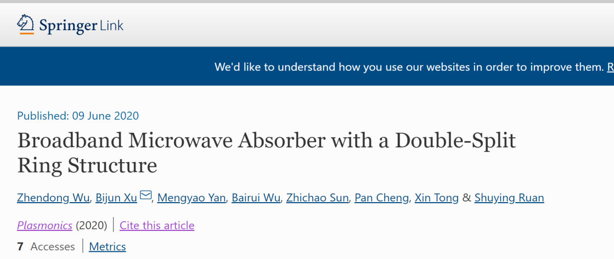 近日, 2017级应用物理学本科生吴震东同学在徐弼军老师指导下以第一作者身份在国际知名期刊《Plasmonics》(IF=2.926,中科院三区)发表了一篇高质量学术论文,这是他们在超材料的吸收损耗特性最新研究成果。论文的通讯作者是徐弼军教授,并以浙江科技学院为第一署名单位。