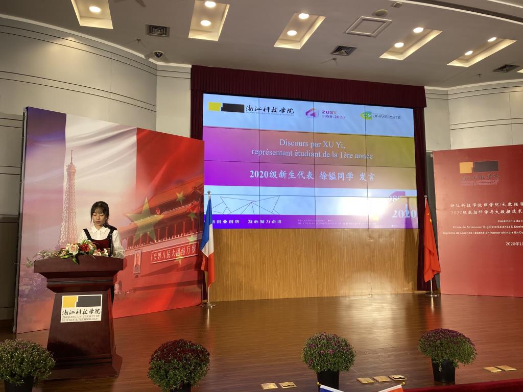 随后,2020级中法班徐镒代表新生发言,表示一定将校长和各位师长的嘱托牢记在心,不负光阴,珍惜机遇,尽快适应大学的学习和生活,高效学习,做到德智体美全面发展。