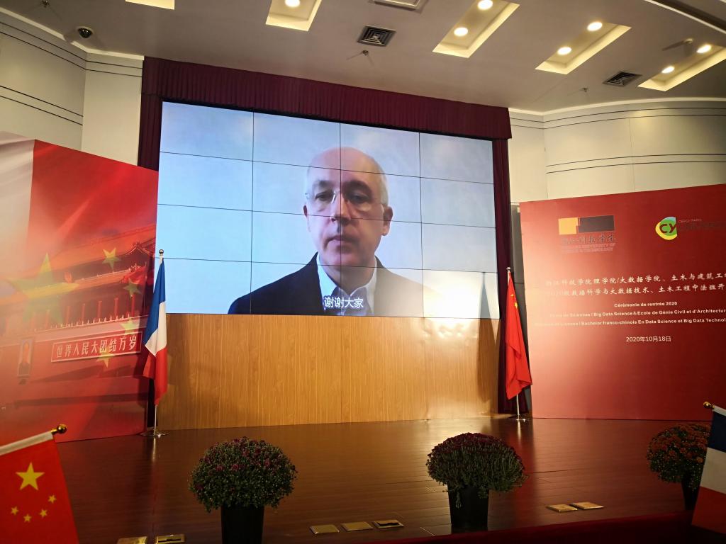 受疫情影响,法国CY赛尔齐·巴黎大学国际处副处长Ayda HADIZADEH女士,数据科学与大数据技术中法项目法方负责人Dan VODISLAV先生,中法土木项目法方负责人Bruno FIORIO先生,CY Tech的国际办公室负责人Michel GUILEMAULT先生通过视频祝贺同学们进入国际化项目学习,希望同学们学有所成,中法项目越办越好。