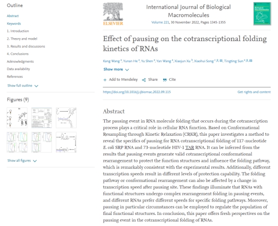 应用物理系孙婷婷教授团队在RNA共转录折叠动力学的研究方面取得重要进展。在《International Journal of Biological Macromolecules》(IF=8.023,中科院一区TOP)期刊上发表了题为“Effect of pausing on the cotranscriptional folding kinetics of RNAs”的研究论文(//doi.org/10.1016/j.ijbiomac.2022.09.115)。浙江科技学院为第一署名单位,应用物理系21级硕士研究生王康为第一作者,孙婷婷教授为论文通讯作者。