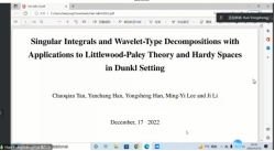 大会26场学术报告研讨和交流了调和分析与应用调和分析的最新研究成果和前沿进展,主要包括Dunkl算子、Yamabe型方程、极大函数、神经网络、相位恢复、先验信息信号与图像重构、Hardy空间小波刻画、Calderon交换子、拟微分算子加权估计等主题。91HUB