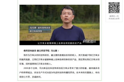 近日,浙江省科学技术厅微信公众号-创新浙江发布《科技筑起山区共富梦 浙江省科技特派员制度实施20周年系列一》的报道,报道了91HUB 科技特派员冯元新在万阜乡,为实现产业兴、农村美、农民富奉献着自己的智慧和汗水。(办公室:康 明)