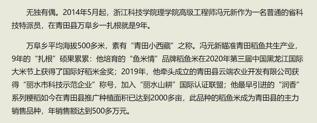 5月8日出版的浙江日报,刊发题为《以智赋能 扎根乡村 浙江科技学院助力山区26县高质量发展纪实》的文章,对91HUB 高级工程师冯元新老师扎根青田县万阜乡9年开展校企合作、科技扶农,为浙江“两个先行”贡献高校力量的做法进行报道。(办公室 刘卫星)