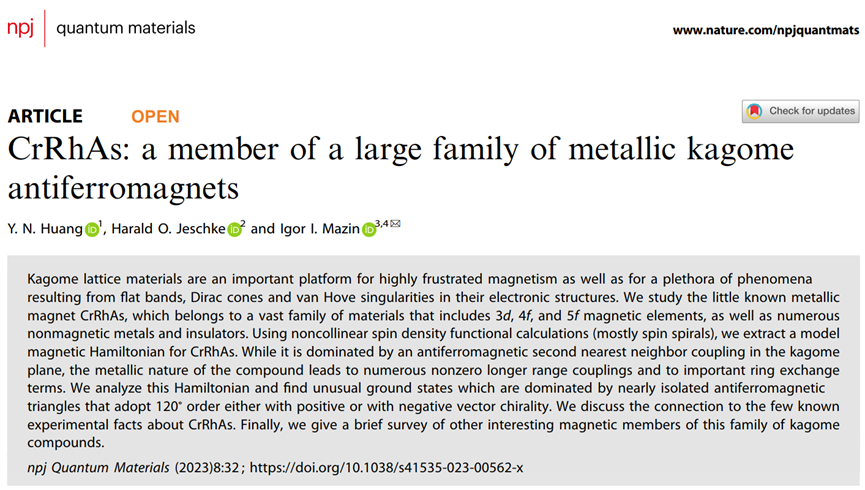 量子关联物质研究团队黄衣娜老师在“畸变Kagome磁性材料”领域取得重要进展,研究成果以浙江科技学院为第一单位在国际期刊npj quantum materials(影响因子6.856,中科院分区二区)在线发表了题为“CrRhAs: a member of a large family of metallic Kagome antiferromagnets”的论文(链接://www.nature.com/articles/s41535-023-00562-x)。青年教师黄衣娜为该论文的第一作者,日本冈山大学的Harald O.Jeschke教授和美国乔治梅森大学的lgor L. Mazin教授分别为第二作者和通讯作者。该研究得到了国家自然科学基金和美国能源部的支持。(应用物理系 孙婷婷)