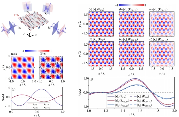 图 干涉场中的自旋与动量的空间结构,以及干涉场、光晶格、准光晶格中纯横向自旋的计算结果。