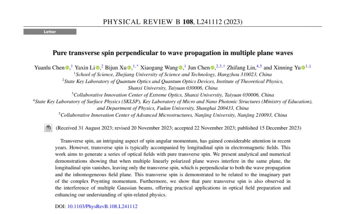 光子与光场调控研究团队中2021级研究生陈远路以第一作者身份在《Physical Review B》期刊上发表了题为“Pure transverse spin perpendicular to wave propagation in multiple plane waves”的创新研究文章。91HUB