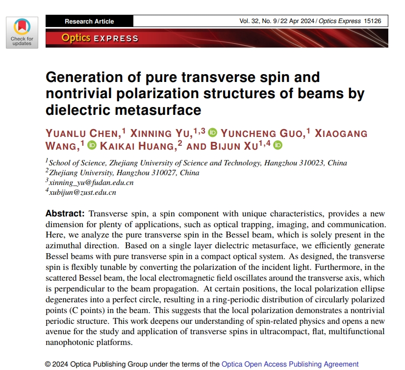 光子与光场调控研究团队中2021级研究生陈远路以第一作者身份在《Optics Express》期刊上发表了题为“Generation of pure transverse spin and nontrivial polarization structures of beams by dielectric metasurface”的创新研究文章。91HUB