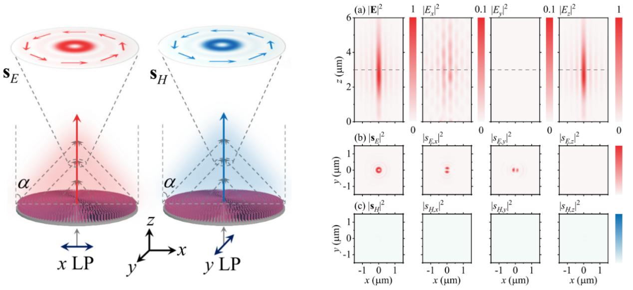 图 超表面产生纯横向自旋的示意图(左图),以及x线偏振光入射下产生纯横向自旋的超表面模拟结果(右图)。