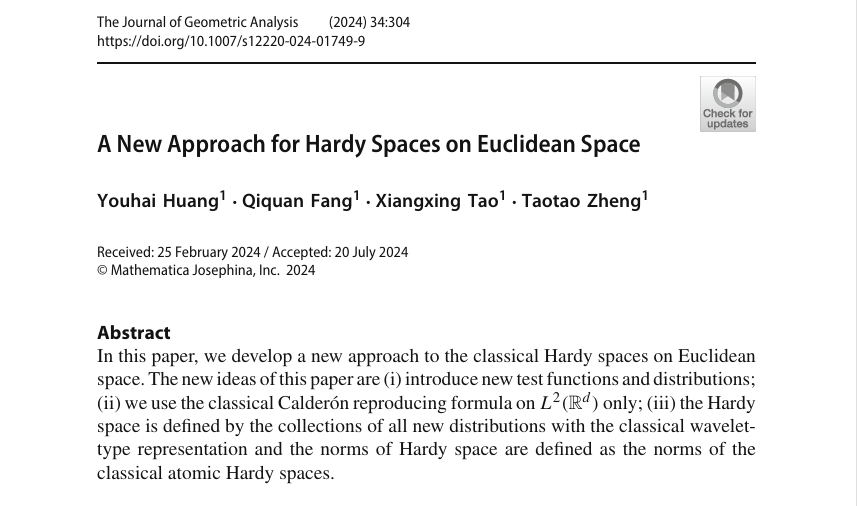 近日,实分析与调和分析及应用团队在J. Geom. Anal. 上发表了题为“A New Approach for Hardy Spaces on Euclidean Space”的研究论文。此论文91HUB