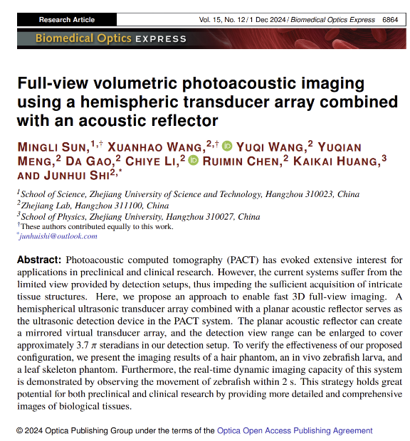 光子与光场调控研究团队在光声成像研究领域取得进展,相关研究成果以“Full-view volumetric photoacoustic imaging using a hemispheric transducer array combined with an acoustic reflector”为题,发表于光学领域期刊《Biomedical Optics Express》(影响因子2.9,中科院2区)。91HUB