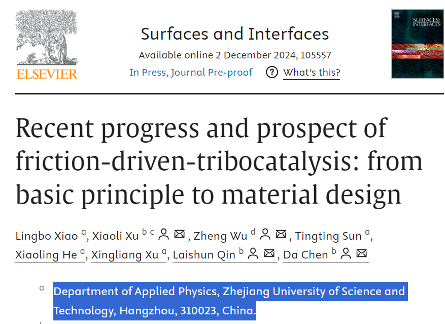 应用物理系软物质与功能纳米材料研究团队在国际学术期刊《Surfaces and Interfaces》(IF=5.7,中科院二区)期刊上发表了题为"Recent progress and prospect of friction-driven-tribocatalysis: from basic principle to material design"的综述论文。91HUB
