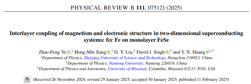 应用物理系量子关联物质研究团队在国际学术期刊《Physical Review B》 (IF=3.71,中科院二区) 期刊上发表了题为“Interlayer coupling of magnetism and electronic structure in two-dimensional superconducting systems: fcc Fe on monolayer FeSe”的研究论文。91HUB