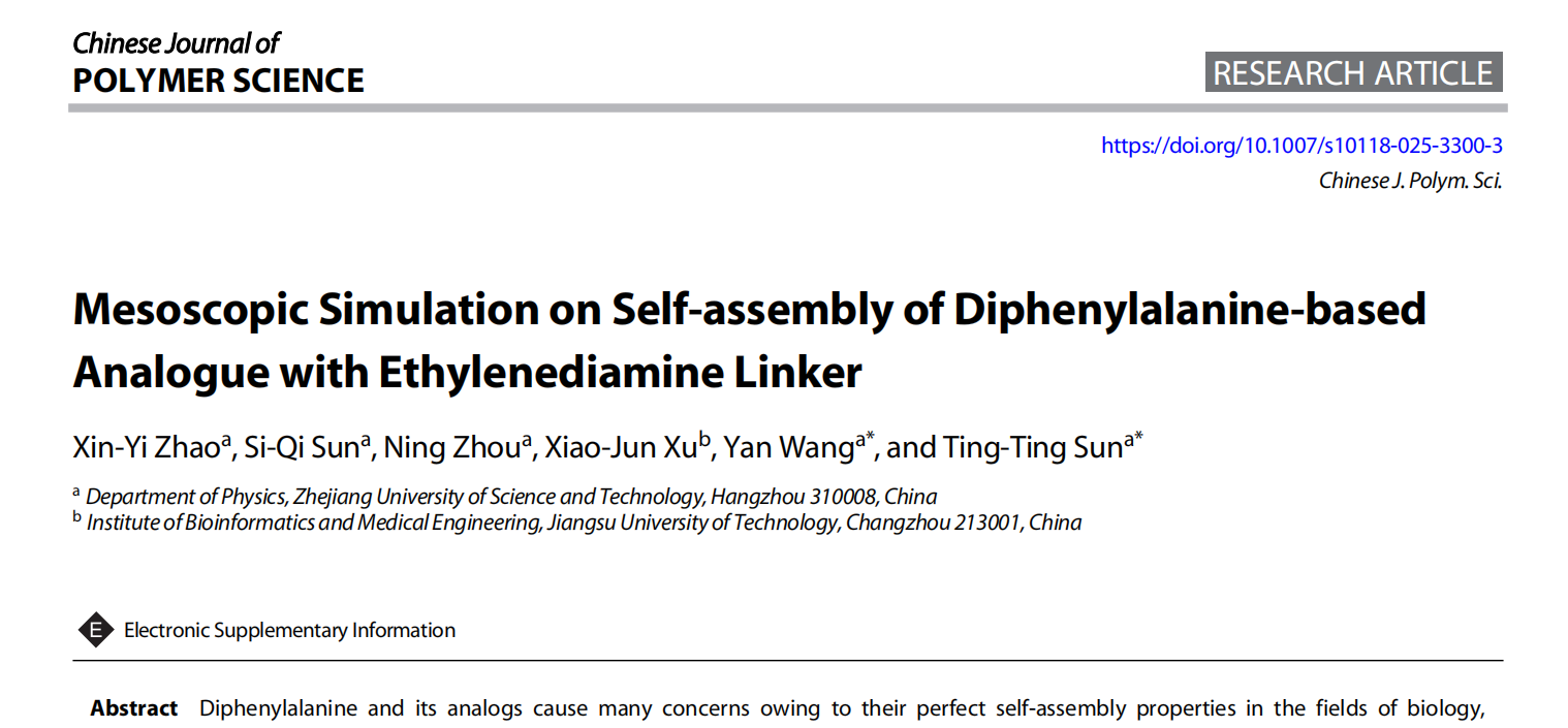 软物质与功能纳米材料研究团队在“短肽衍生物自组装领域”取得重要的研究进展,相关研究成果以浙江科技大学为第一单位在国际期刊《Chinese Journal of Polymer Science》(IF = 4.1,中科院SCI二区,JCR Q1)上,在线发表题目为“Mesoscopic Simulation on Self-assembly of Diphenylalanine-based Analogue with Ethylenediamine Linker”的论文。物理学硕士研究生赵欣怡为该论文第一作者,应用物理系王艳博士和孙婷婷教授为共同通讯作者,91HUB