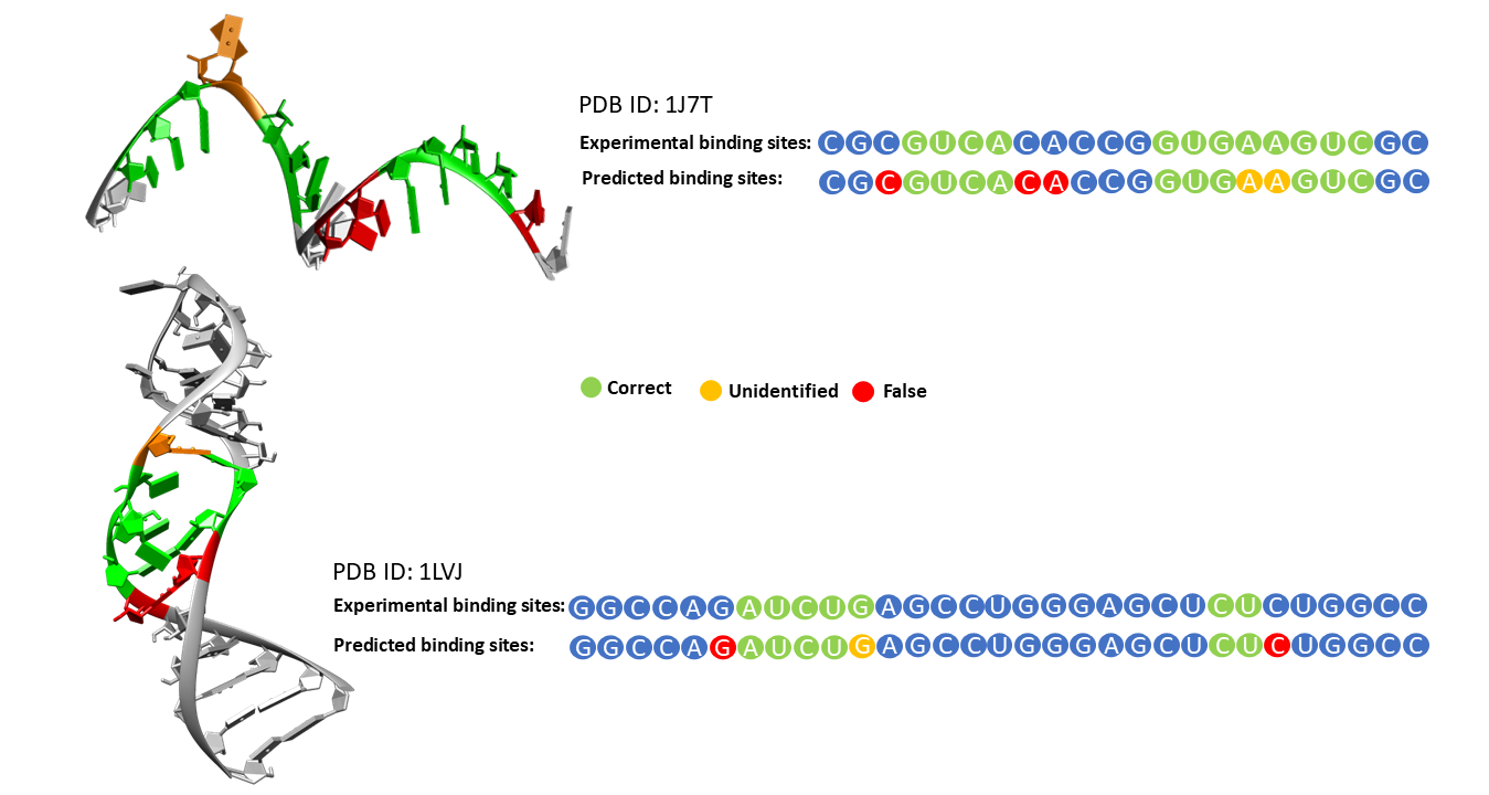 通过在440个结合口袋上进行训练,该模型实现了结合口袋层面 90%的分类准确率。为了获取核苷酸分辨率下的结合位点,采用全空间枚举的方法提取结合口袋,使口袋信息交叉覆盖至每一个核苷酸,随后基于频次分析获得核苷酸的结合位点(图 3)。通过测试数据集 Test9和Test18 进一步测试,模型在Test9 数据集上的精确率约为 77%,在 Test18 数据集上的精确率约为 72%,这表明模型在不同测试集上具有较好的稳定性和泛化能力。相较其他算法,本研究的学习算法在精确率等指标上有较大提升,并在捕捉RNA-small molecule之间的物理相互作用方面特别有效。此项工作得到了国家自然科学基金、浙江省自然科学基金的资助。