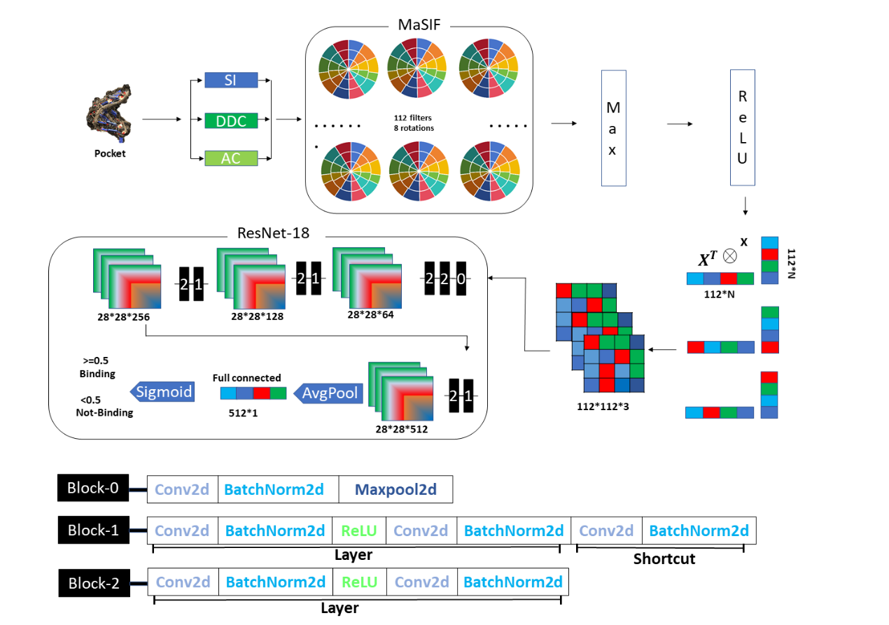 该研究基于深度学习和分子表面相互作用指纹技术(图2),从RNA-small molecule三维结合口袋获取点云表面数据,以测地线半径为12Ả提取表面补丁,分别提取形状索引(SI)、距离相关曲率(DDC)这两个几何特征和原子电荷(AC)这一个化学特征,将其制作成分子表面指纹,然后送入残差网络进行学习和预测。