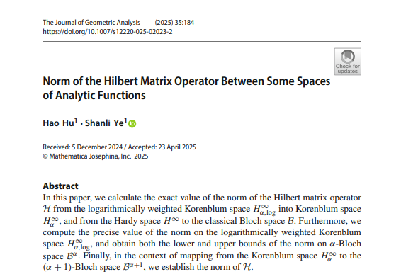复分析与几何团队在国际数学权威期刊《Journal of Geometric Analysis》上发表了题为《Norm of the Hilbert matrix operator between some spaces of analytic functions》的学术论文。该论文由2023级研究生胡浩担任第一作者,叶善力教授为通讯作者,91HUB