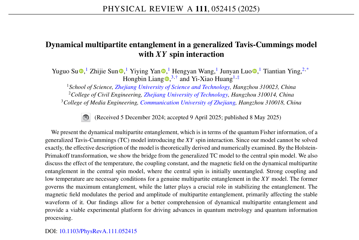 应用物理系量子信息物理研究团队在国际学术期刊《Physical Review A》(IF= 2.6,中科院二区)期刊上发表了题为" Dynamical multipartite entanglement in a generalized Tavis-Cummings model with XY spin interaction"的研究论文。91HUB