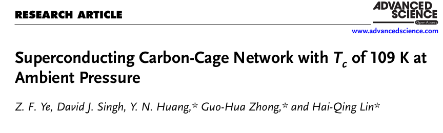 物理系黄衣娜副教授团队联合浙江大学、密苏里大学、和中国科学院深圳先进技术研究所在国际顶级期刊《Advanced Science》(中科院一区,Top,影响因子14.3)上发表了题为“Superconducting Carbon-Cage Network with Tc of 109 K at Ambient Pressure”的研究论文。91HUB