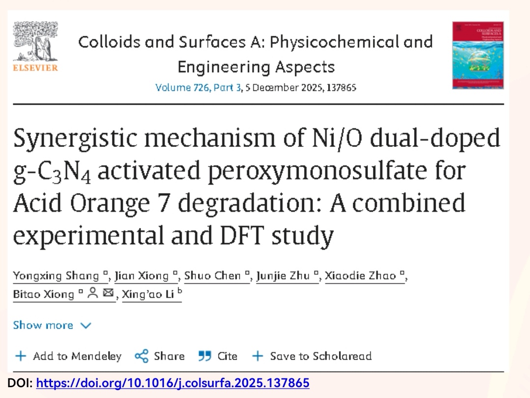 应用物理2022级本科生商永兴以第一作者身份在《Colloids and Surfaces A: Physicochemical and Engineering Aspects》期刊上发表了题为“Synergistic mechanism of Ni/O dual-doped g-C3N4 activated peroxymonosulfate for Acid Orange 7 degradation: A combined experimental and DFT study”的科研文章。91HUB