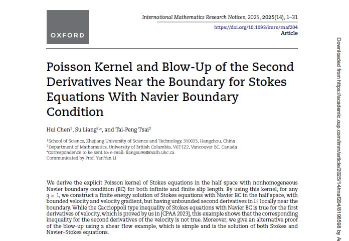2. 《Poisson kernel and blow-up of the second derivatives near the boundary for Stokes equations with Navier boundary condition》发表在IMRN上。