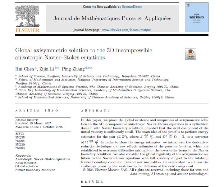1.《Global axisymmetric solution to the 3D incompressible anisotropic Navier-Stokes equations》发表在JMPA上。