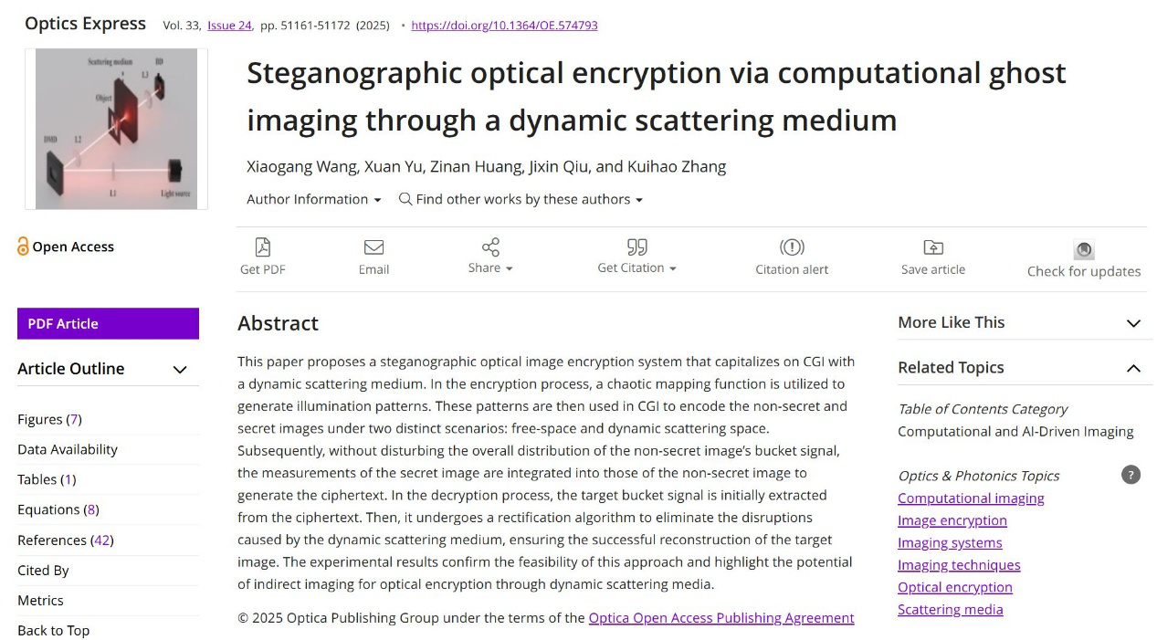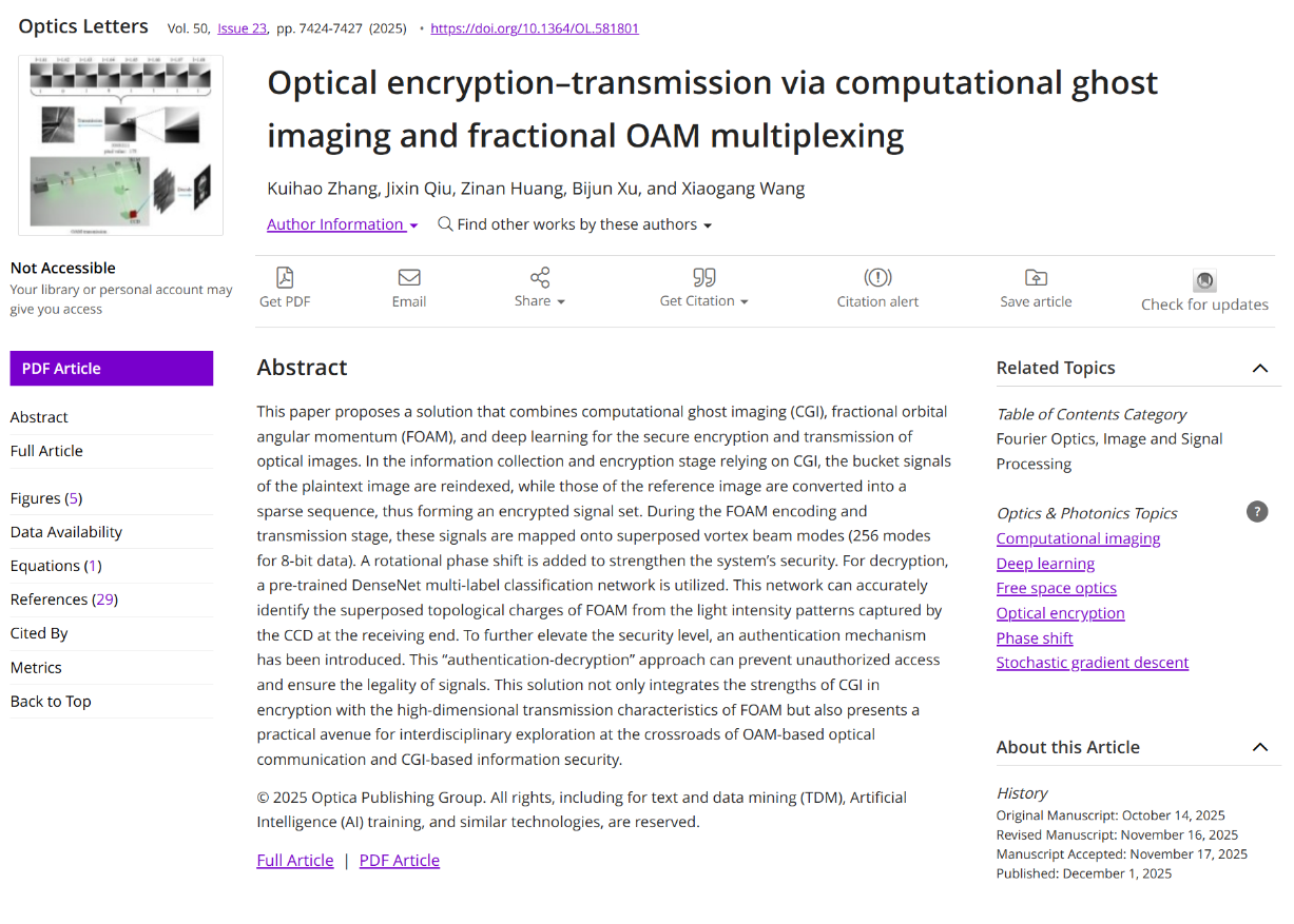 光子与光场调控研究团队在光学信息安全传输领域取得重要进展,相关成果以《Optical encryption–transmission via computational ghost imaging and fractional OAM multiplexing》为题,发表于光学领域权威期刊《Optics Letters》(影响因子 3.3,JCR 一区、中科院二区)。91HUB