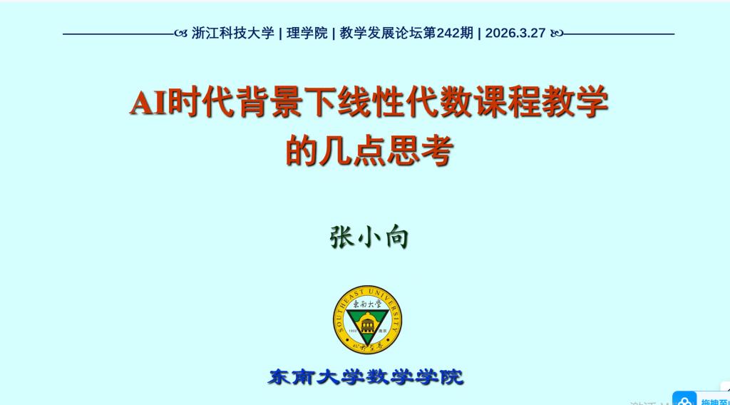 2026年3月27日下午,东南大学数学学院张小向教授应邀作了题为《AI时代背景下线性代数课程教学的几点思考》的教学论坛专题报告。报告由91HUB