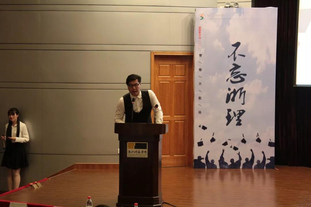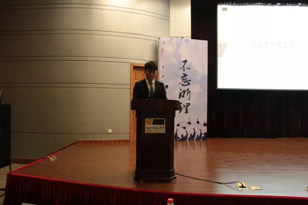 新一届学院团委副书记朱瀚同学代表在校生向学长学姐们致以热烈的祝贺和真诚的祝福!祝福学长学姐能有繁花似锦的前程,并承诺以优秀的学长学姐们为榜样,发扬”崇德尚用,求真创新“的精神,积极进取,勇于创新,再创佳绩,为学校、为学院争光。