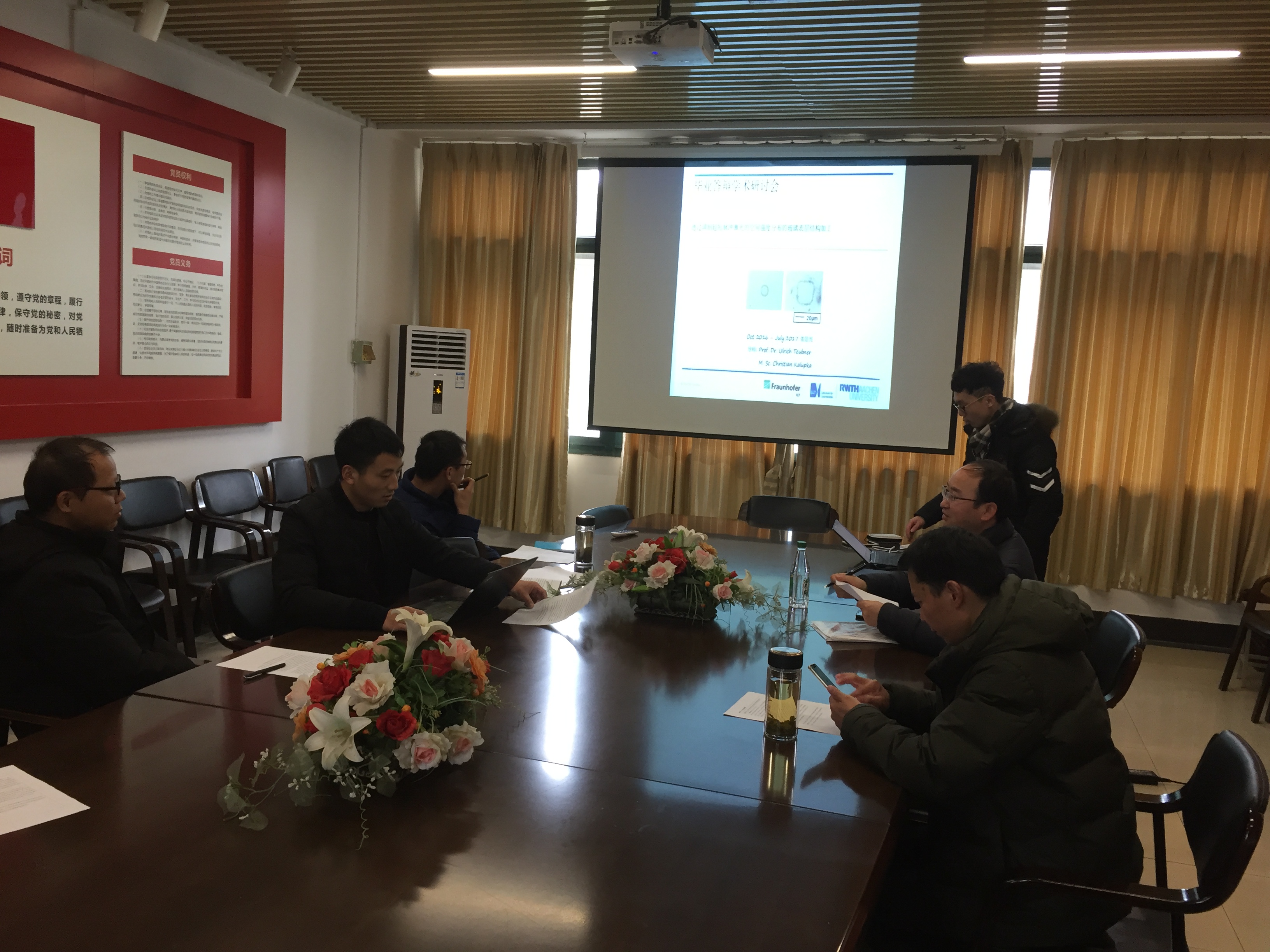 答辩会上,董景兴同学就毕业设计“Oberflächenstrukturierung von Glas durch räumlich modulierte Intensitätsverteilung ultrakurz gepulster Laserstrahlung的选题背景及其意义、主要内容、创新点等方面做了较详细的阐述。答辩委员会按照联合培养毕业论文答辩的相关程序,经过答辩、质询、讨论等环节,答辩委员会最终一致通过了董景兴的论文答辩。( 外事办:邓清艳)