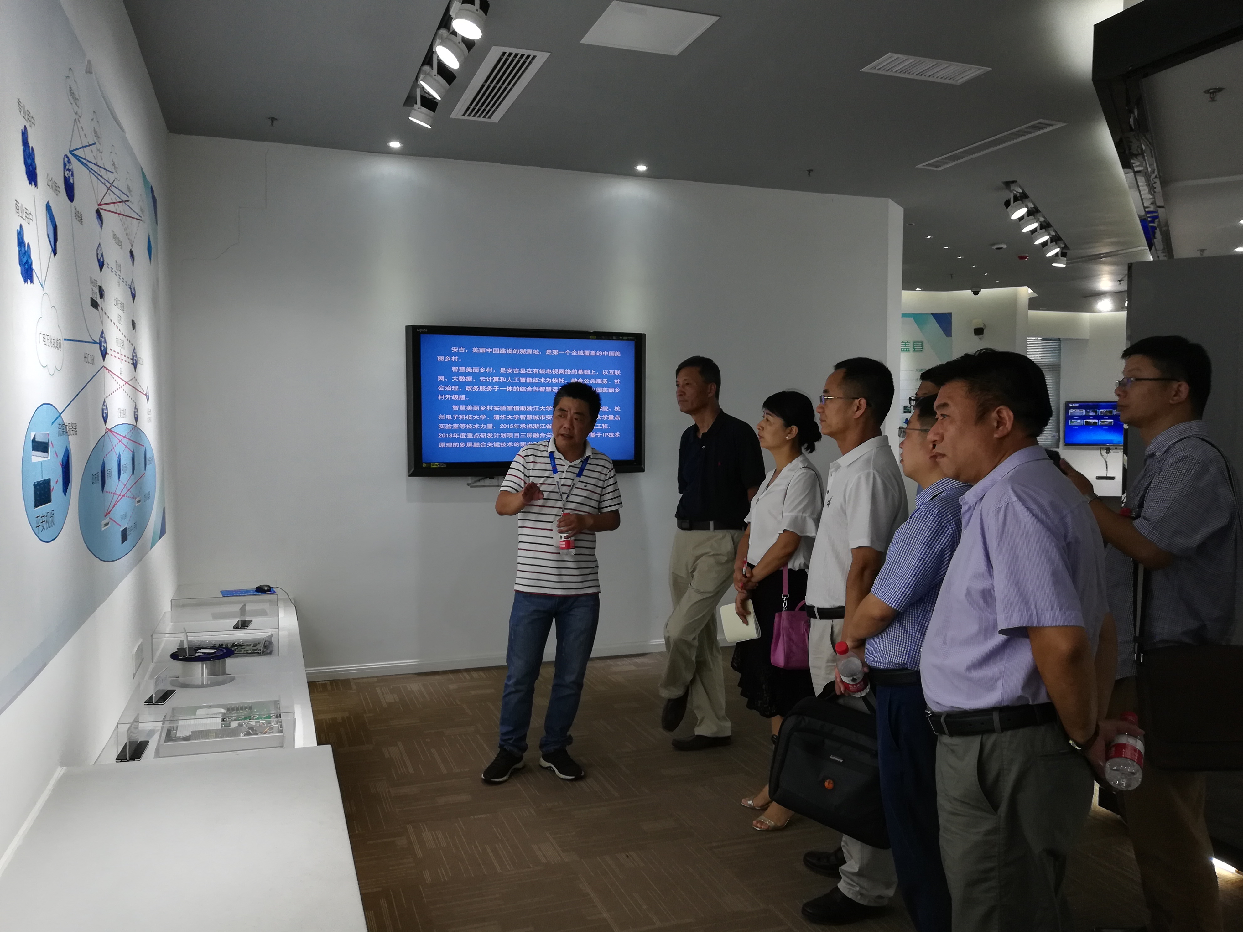 杨巍峰带领老师和同学们参观了智慧美丽乡村实验室,并在参观中逐一介绍了安吉新闻集团数据处理方面的专利技术以及应用成果。自主研发的“爱安吉”APP是一款集新闻浏览、视频收看、生活指南等15大功能的软件,此软件的开发和上线受到安吉百姓的由衷欢迎和广泛使用,下载量超过20余万次;自主知识产权“智慧网驿物流终端”获国家新闻出版广电总局颁发的“最具特色智能硬件产品设计奖”,属全国县级广电台唯一。安吉新闻集团成立优秀创新团队,不断推陈出新,设计和开发新产品,服务地方百姓,力创美丽乡村。通过产品渠道,依托新媒体阵地,采集各行业数据,结合“云”技术,实现云存储、云计算、云服务,努力打造安吉权威网络信息平台。