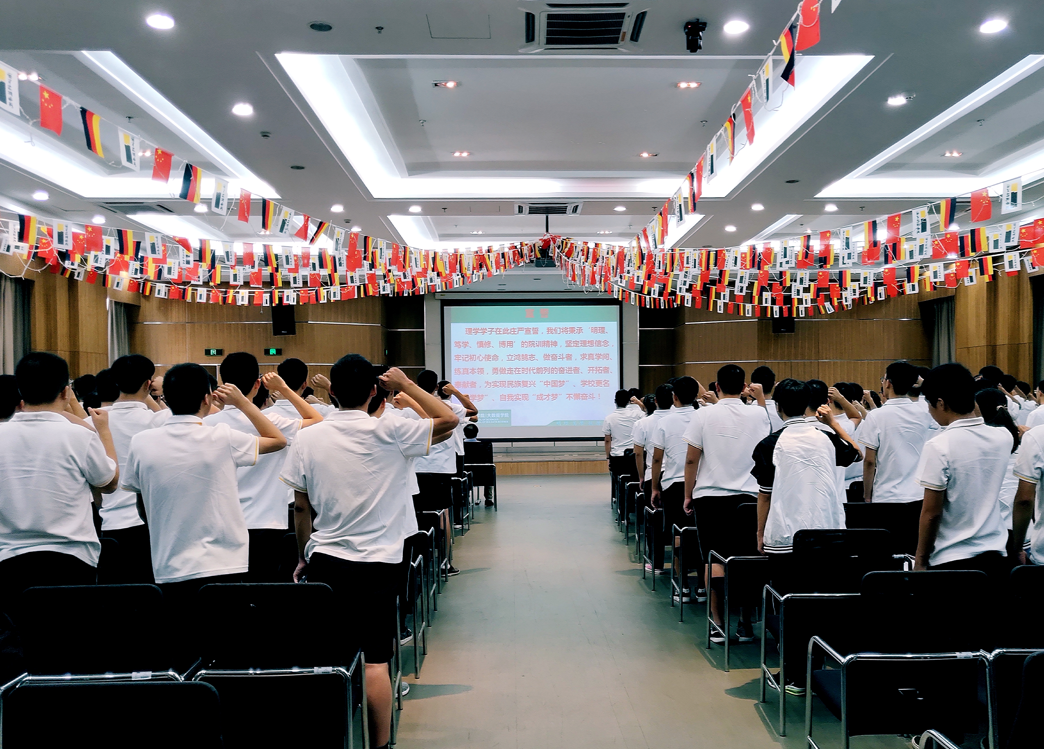 在新生敖翔同学的领誓下,全体新生起立,高举右手激昂宣誓:理学学子将秉承‘明理、笃学、慎修、博用’的院训精神,坚定理想信念,牢记初心使命,立鸿鹄志、做奋斗者,求真学问、练真本领,勇做走在时代前列的奋进者、开拓者、奉献者,为实现民族复兴“中国梦”、学校更名“大学梦”、自我实现“成才梦”不懈奋斗!