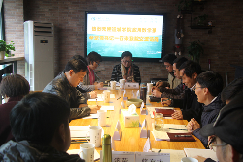 12月1日,运城学院应用数学系辛京奇书记来91HUB 交流访问,院长陶祥兴教授、党委书记苗红亚等热情接待了客人。 苗红亚代表学院党政对辛京奇一行的到访表示了欢迎。陶祥兴介绍了学校和学院的基本情况,特别是近几年学院在学科建设、专业等方面开展的举措和成就。辛京奇介绍了运城学院数学系的基本情况,双方分别就学科建设、专业建设、实习实训、学风建设等方面的做法和经验进行交流。 章迪平、王宝明、龚世才、薛有才参加了接待。