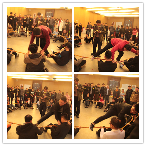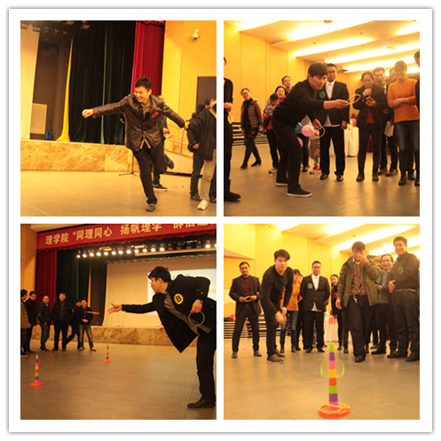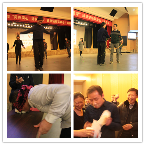 联欢会上,院长陶祥兴教授首先致辞,他简要总结了在过去一年学院所取得的成绩,感谢大家的辛苦付出。他希望在新的一年,全院师生更加齐心协力,同理同心,追求卓越,各方面更上一个台阶,并祝愿大家新春愉快、身体健康、阖家幸福。随后,在主持人胡月、王杨、马鹏飞和贺莎的主持下,老师们依次登台演出,有配乐诗朗诵、有男女声独唱、豫剧清唱、乐器演奏、武术表演,还有集体舞蹈,丰富多彩的节目充分展示了各自的才艺。演出结束后,紧接着又开始了趣味体育活动。所有教职工随机分为“金鸡报晓”、“闻鸡起舞”、“机不可失”和“鹤立鸡群”四个队,开展了趣味性很强的”萝卜蹲”和体现集体合作能力的“走钢丝”等竞赛活动。各组的比分你追我赶,好不热闹。最终,四支队伍以各项比赛累计的总分决出了名次。