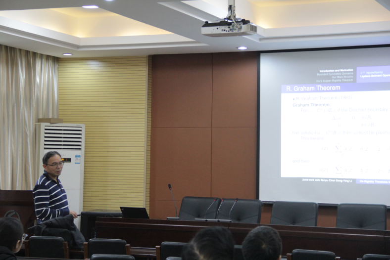 Song-Ying Li教授主要从事复分析、非线性偏微分方程,调和分析及复几何等方面的研究工作,本次讲座中Song-Ying Li教授向大家展示了复分析中调和函数和调和映射的一些最新研究,以及与天津大学Renyu Chen教授共同研究的复函数中单位球C ^ n光滑边界条件等问题。