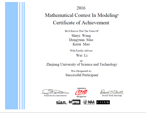 的王树一(14信计)、毛珂瑞(14信计)、毛冬媛(14应用物理)同学组成的代表队(指导教师:李蔚)获得国际三等奖(Successful Participant)。