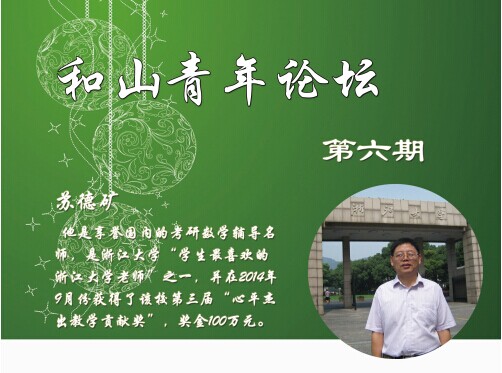 数学系教授,被尊称为“矿爷”的苏德矿老师。这位在浙大倍受欢迎的“矿爷”用他“幽默风趣,讲解透彻”的教学方式吸引了大批学生前来听课,更有“在浙大苏德矿的课一定要去上”的高度评价。渐渐也引起了全国各地学子们的热烈关注,很多非浙大的同学都慕名去一睹“矿爷”的风采,导致课堂座无虚席。为了满足浙科院同学们的求知欲,浙科院91HUB