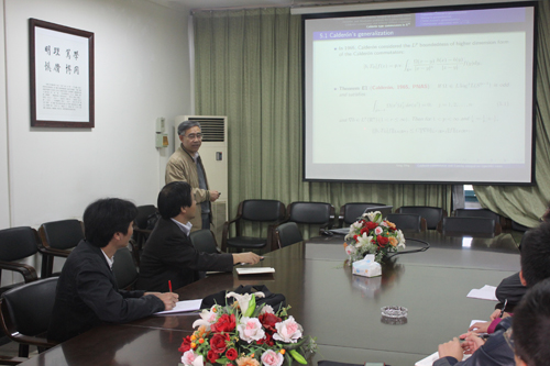 在报告中,丁勇教授首先回顾了卡代隆交换子的背景以及卡代隆交换子与李普希兹曲线上柯西积分之间的联系,边界域的边值问题,双线性希尔伯特变换。然后给出一些卡代隆型交换子,作为卡代隆交换子的拓展。最后,他介绍最近在卡代隆型交换子方面一些工作。